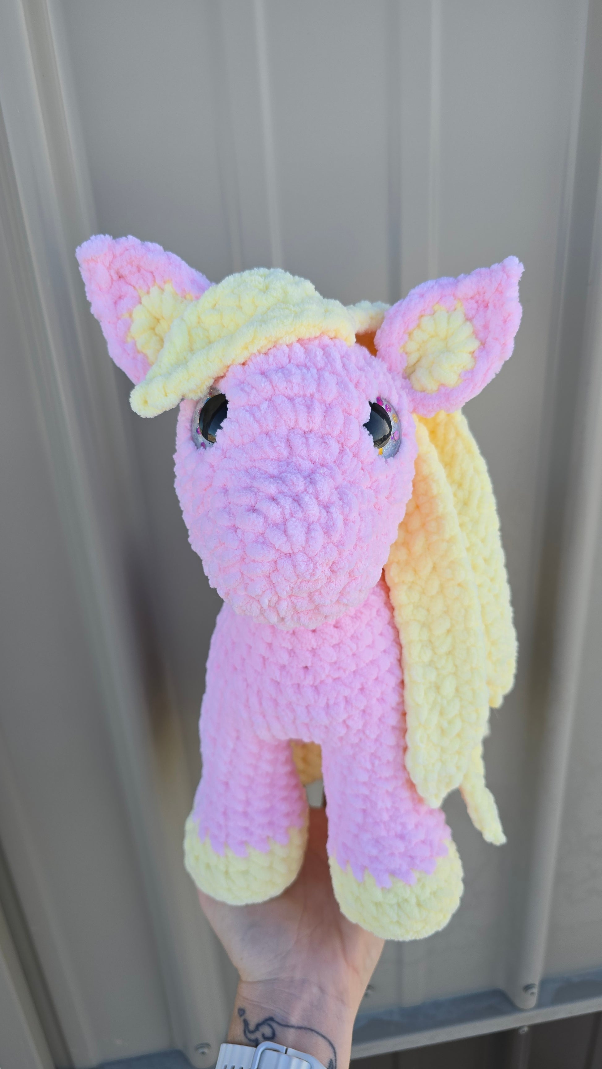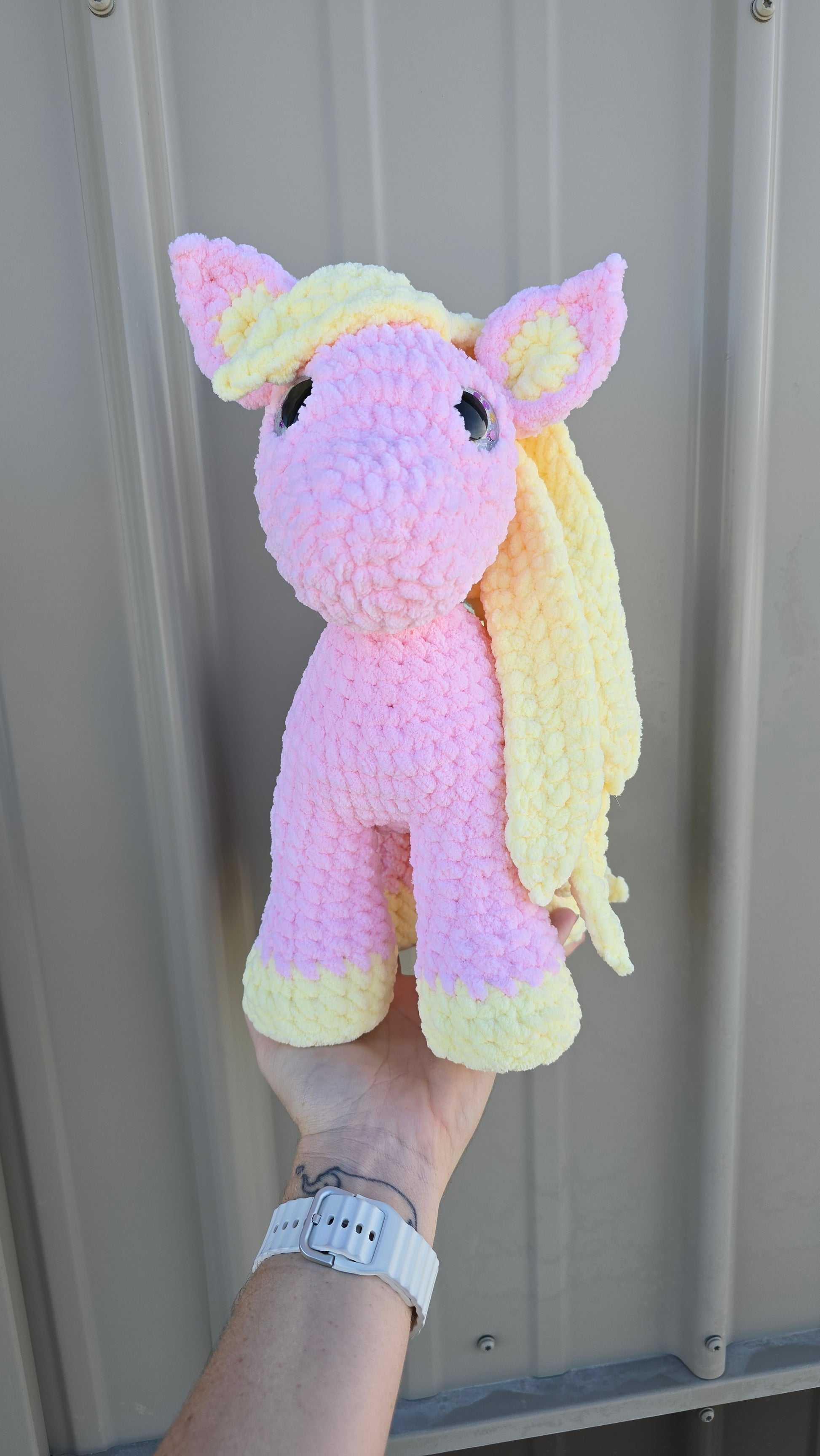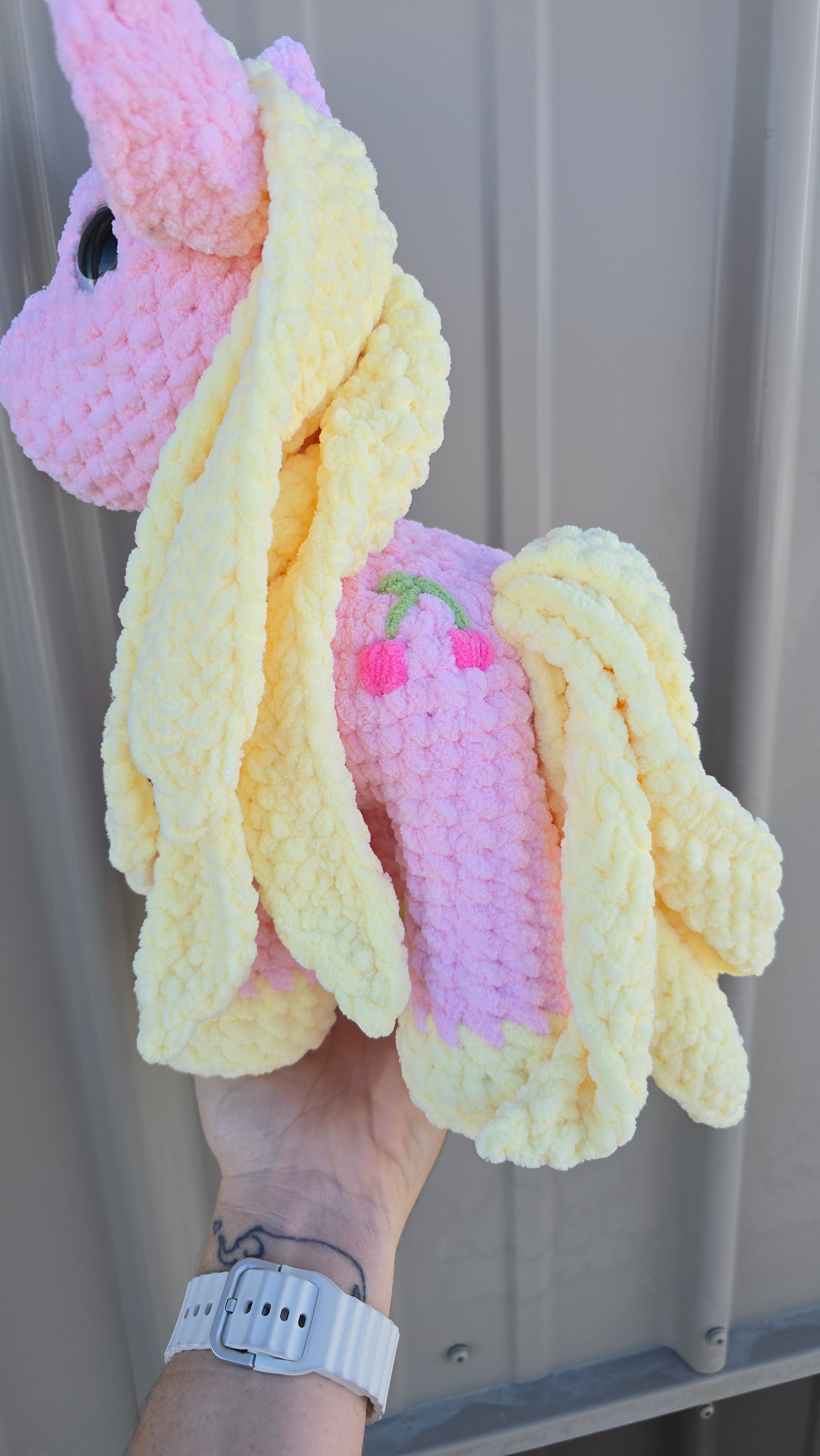 A pink and yellow pony plushie hand crocheted with soft chenille yarn and stuffed with squishy fiber fill! She has cherries embroidered on her behind and can stand on her own. She is about 13inches tall and is made with custom hand-painted eyes.